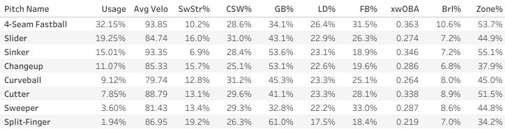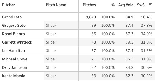 Garrett Whitlock had a great start against the Angels yesterday, making it through seven innings and giving up just one run. His slider is looking insanely good this year with a 31% SwStr%!