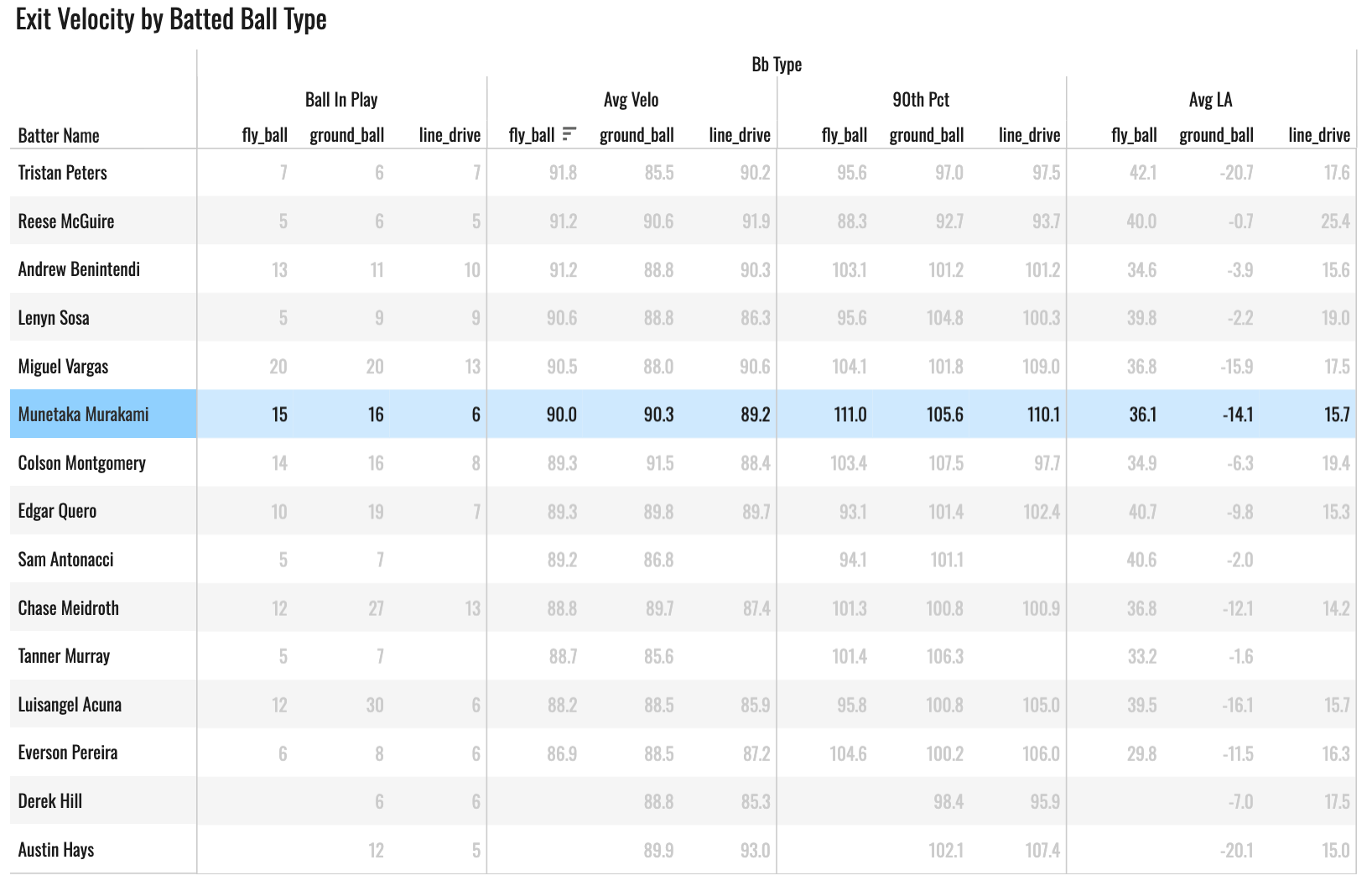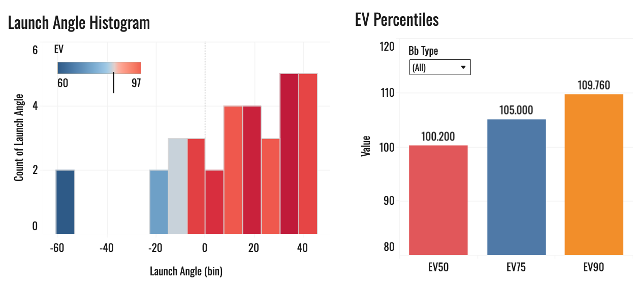 He’s hitting very few balls directly into the ground, which is good. And the hardest contact is all in the air. His EV90 on fly balls is elite at 111, and elite on line drives at 110.1. On grounders, it’s not as good at 105.6. That’s not a problem, and I think it’s just a sign that the swing is fully tuned for hitting homers.
