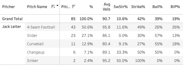 Leiter did not command his pitches well at all with a very bad 42% Strike%. That was the 141st-worst Strike% of the season for starters (out of 560 total starts sampled). How did I know that? Because I have this resource that gives you numbers for each individual start all season long. I know my Google Sheets are all over the place and sometimes confusing and hard to find sometimes, but hey I’m one guy just throwing stuff at the wall here. Someday, I think I’ll clean this up and get things on a new website where everything works better. But most of these resources are intended just for my own writing-aid.
