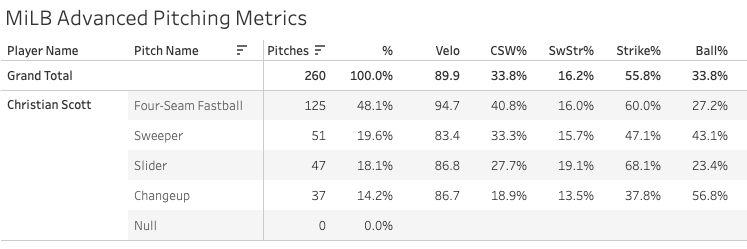 But the advantage Scott seems to have is elite command. A 33.8% Ball% is really impressive and now he’s at a career 5.7% BB% in 31 starts, which would be elite in the Majors but is even MORE elite in the minors where walk rates are high. Be ready to jump on him when he gets the call, or just go ahead and get ahead of it right now if you have a free stash spot.