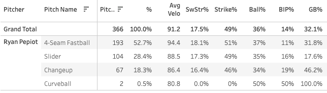 Very little happened in baseball yesterday as most teams got the day off. Ryan Pepiot was the pitcher of note witha nice 6 IP, 3 H, 1 R, 7 K, 3 BB line. Here’s the updated arsenal numbers: