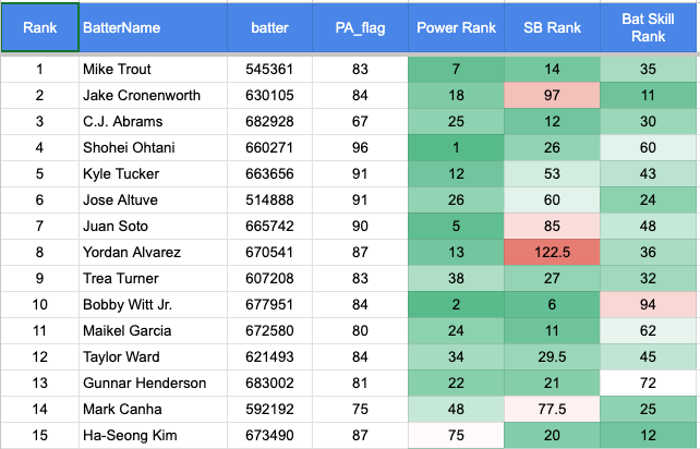 Power relies mostly on barrels and pulling fly balls, steals is looking a lot at attempt rates and some speed stuff, and then the “bat skill” one is about having a high contact rate and a higher line drive rate (trying to isolate batting average there).