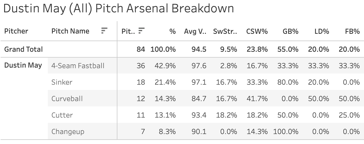 Dustin May's FF usage (42.9%) up 19.9 points