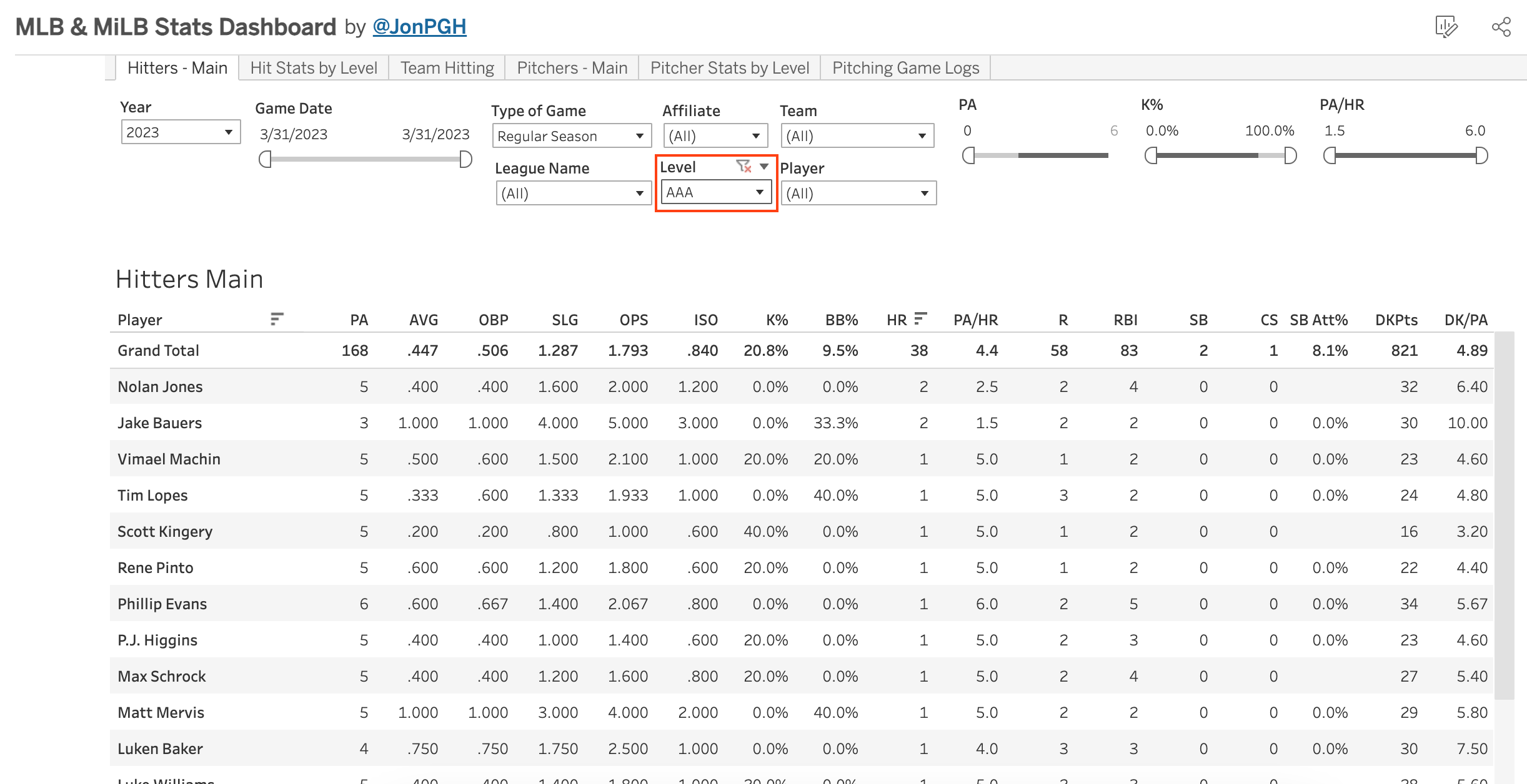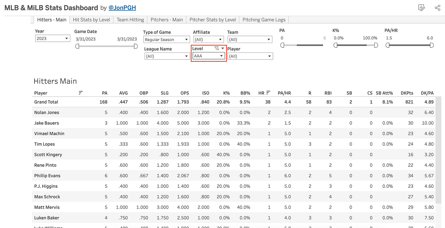The AAA season also got under way last night. Here’s a reminder that paid subs can see all minor league stats on the MLB & MiLB Stats Dashboard, just utilize the “level” drop-down, like so: