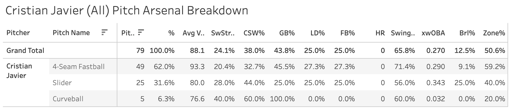 1. Cristian Javier (HOU): 23.2 SwStr%, 36.6 CSW%