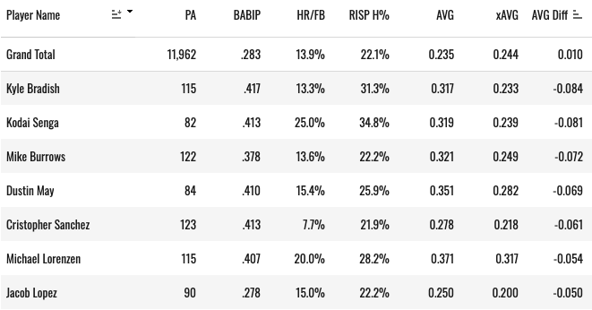 There’s much good news here for the future. His .317 AVG allowed towers above his .233 xBA. In fact, he has the largest differential in the league there: