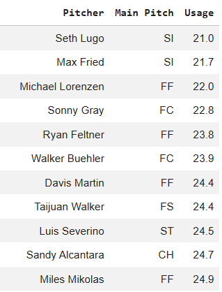 And there’s a ton of dudes with six pitches. We can get a feel for arsenal depth by looking at which pitchers have the lowest usage of their most-thrown pitch. Seth Lugo dominates this awith just 21% usage on his most-thrown pitch, which is the sinker. Here’s the top 10: