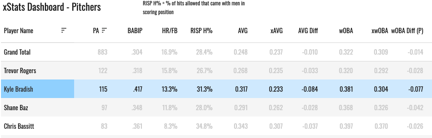 We can also check the PITCHER LUCK tab on the dashboard to see how Bradish has been in this regard.