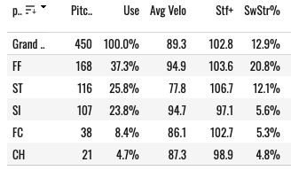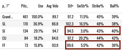 The slider is the money pitch, and it always has been. But we’re seeing that big time this year with a 26.1% SwStr%, a 52% Strike%, and a .303 xwOBA. He throws a sweeer behind it, and that’s been fine.