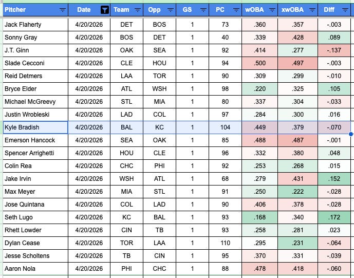 Bradish allowed about a .449 wOBA (the number can be different depending on what exact weights you’re using in your calculation), and a .379 xwOBA. So yeah, that’s a higher actual than expected. But he gave up ten hits, we figured a few of those weren’t hit super hard. The .379 xwOBA is bad, and that’s the more important thing. His 14.4% SwStr% wasn’t bad, but the 39.4% Ball% was.