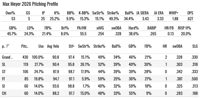 His fastball has never been good. So far, he’s put up an elite 59% Strike% with it, but that’s really tough to believe in for the long haul because of the lack of whiffs (5.9% SwStr%). That is a Strike% to SwStr% gap I’m not sure I’ve ever seen. The Stuff+ model doesn’t like his fastball either (97.1), and we have a history of it being bad. So I think it’s going to be bad, and he’ll be held back by that.