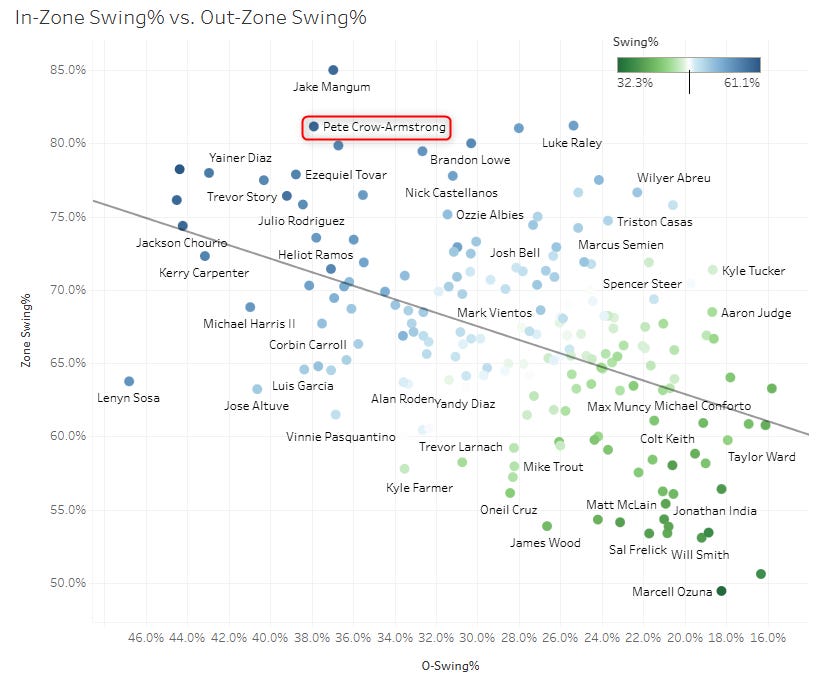 He’s fifth in the league in scoring (Tucker, Judge, Carroll, Tatis Jr.). The exit velocity is up (103.1 EV90, which still isn’t great, but it’s high enough to believe that the guy can hit some dingers). The contact rate is a very nice 78%, and that should turn into a solid K% when paired with his extremely high swing rate (60%).