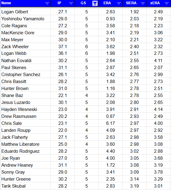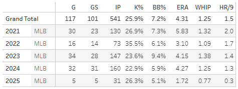 The 47% GB% is not low, but it’s nowhere near the elite level you’d want it to be at. It’s up to 53% in the last two starts, but he’s given up four homers in those two. So he’s been very lucky there weren’t more guys on base.