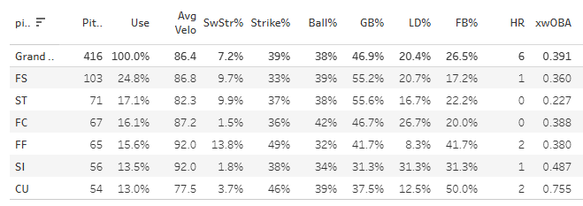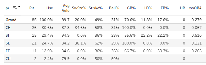 That’s abut what he’s been doing this year. He has split things very evenly between the slider (27%), changeup (26%), and sinker (26%), with four-seamers (18%) and curveballs (4%) mixed in less commonly.