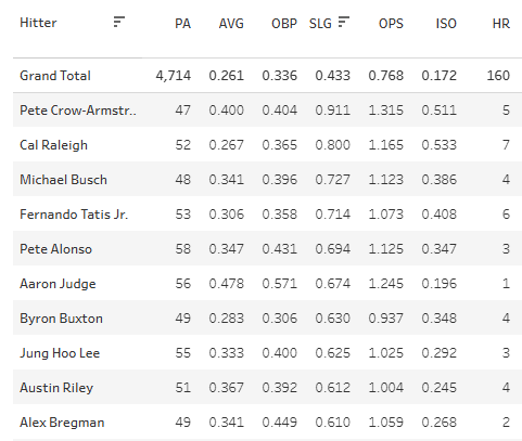 Ben Rice - 0.456 xwOBA, 22.6% Brl%, 76.7% Contact%, 21.4% Chase%, 22.4% K%
