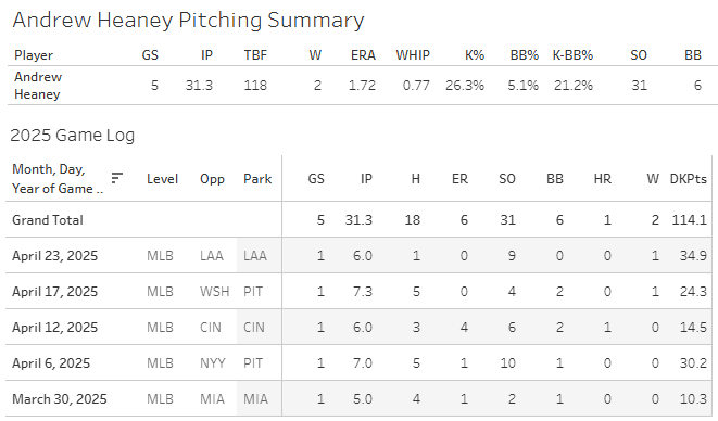 The SwStr% is 13.3% and the Ball% is 33.4%. So that’s an MFQ qualifier. I think we can buy into Heaney a bit.