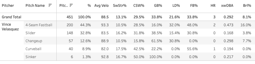 Vince Velasquez's SL usage (49.0%) up 16.5 points