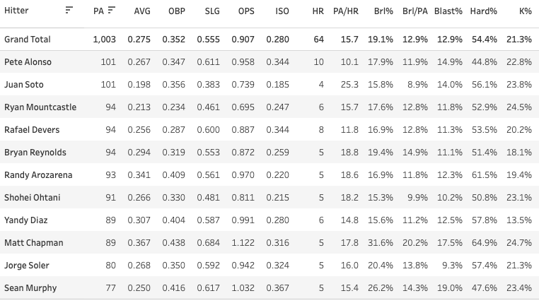Here’s a table of all of the hitters with 70+ PA, a Brl% above 15%, and a K% below 25%: