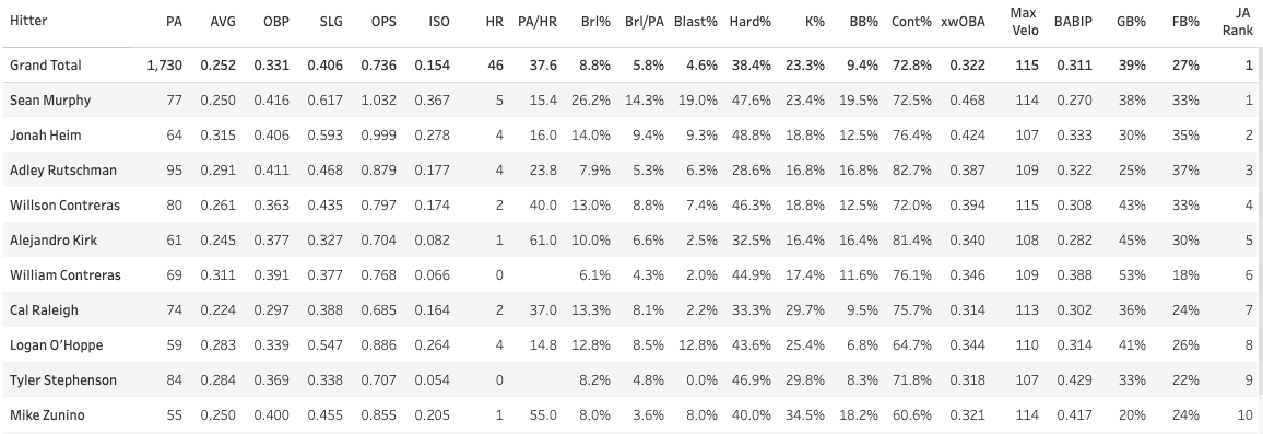 As for Heim, he has a very nice 14% Brl% and a 19% K%. That comes with a strong 76% Contact%, so he’s checking all of the boxes. He’s the JA model’s #2 catcher: