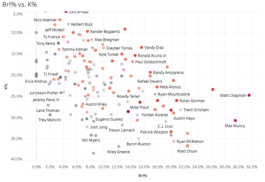 Luis Arraez and Mauricio Dubon are striking out so little that they’ve pushed past the 5% bound I set up on the plot. That’s annoying, give us a couple of strikeouts this week bro’s.