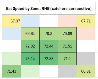More on that pitch type stuff, here is average bat speed by pitch location from right-handed hitters this year: