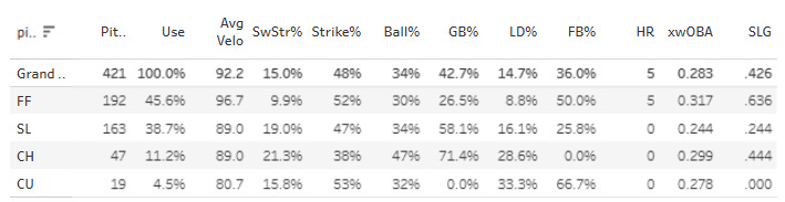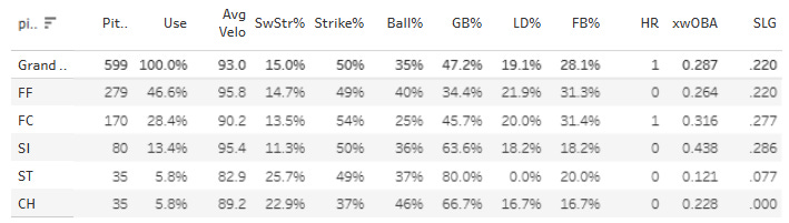 He has been basically as advertised. The strikeouts aren’t phenomenal (23.6%), but he is fililng up the strike zone with quality pitches. He leads the league (for SP) in zone rate at 64.6%. 69.3% of his first pitches are in the strike zone, that’s behind just Colin Rea and Seth Lugo. His in-zone SwStr% is strong at 13.9%, and once again, few hitters are able to square him up with a .319 SLG generated all together.