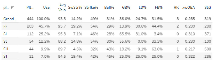 Still a very strong 15% SwStr% + 34% Ball% combo. But you can see that hitters have been able to hit the four-seamer. And that isn’t surprising since he’s down below 97 with the pitch.