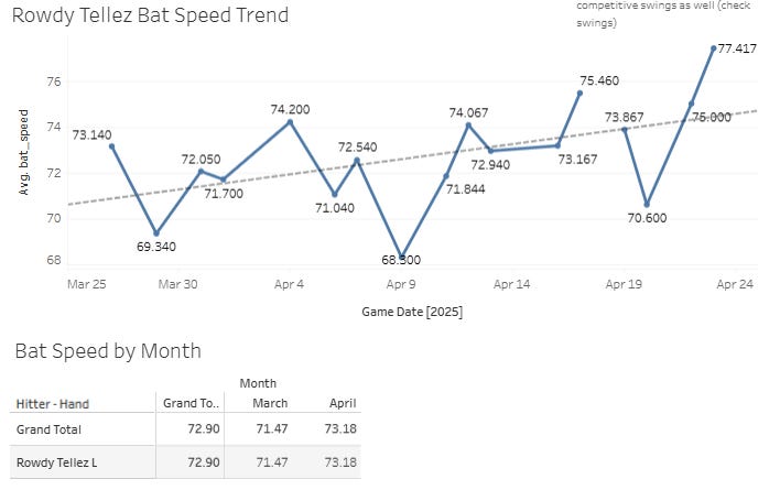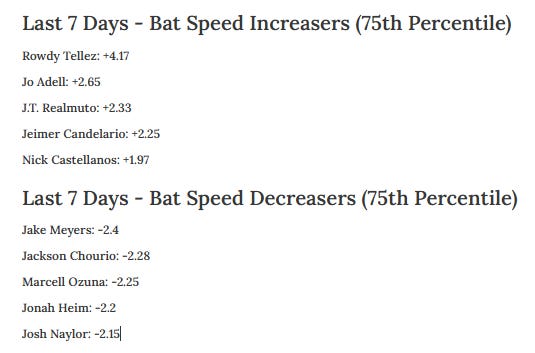 It’s been a long time I’ve added new stuff to the automated part of the daily notes. I want to keep adding on and refining that to make it better and better. Someone asked me to add recent bat speed comparisons, so I’ve done that. You will see the biggest L7 changes in bat speed using 75th percentile bat speed.