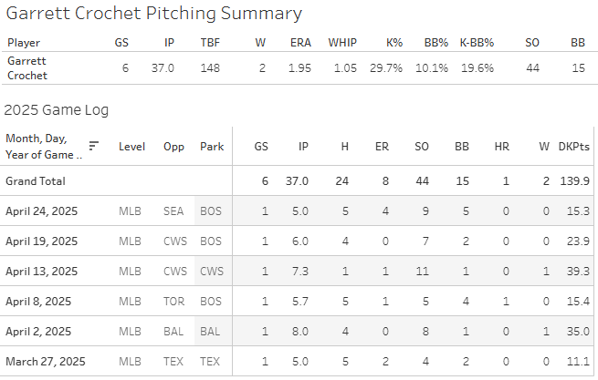That SwStr% is elite at 15% and the .220 SLG is incredibly low. That will have to come up a touch, but all things considered it’s safe to say Crochet is a top five arm still. The Red Sox have no hesitation on his usage, that’s for sure. He threw 110 pitches yesterday and now leads the league with 99.8 pitches per start.