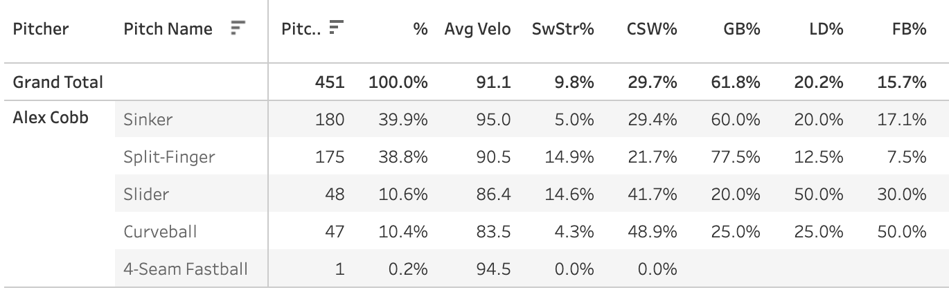 Alex Cobb has been all over the place. Two starts ago he got a ton of whiffs and strikeouts but gave up hits and walks didn’t put together all that great of an outing. Last night he threw a complete game shutout but struck out just four batters.