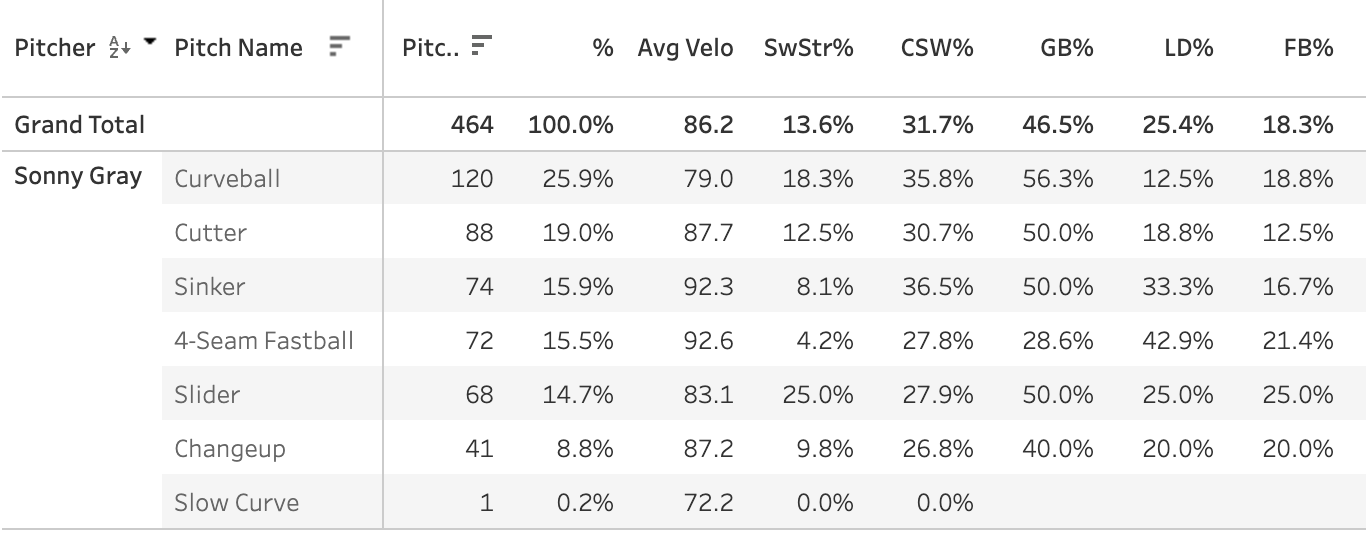 Sonny Gray's FC usage (33.6%) up 19.0 points