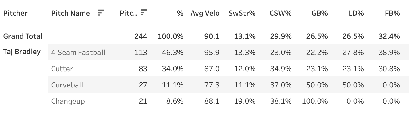 Taj Bradley's FC velo (37 pitches) DOWN -1.5mph to 86.2