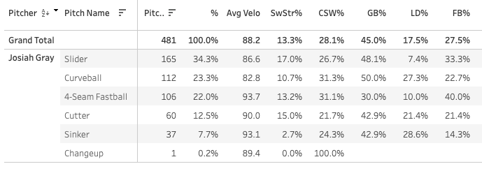 Let’s start with Josiah Gray, here’s his season pitch mix: