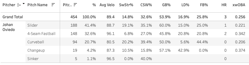 Johan Oviedo - 104 TBF, 34.4% CSW%
