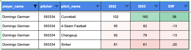 415 pitches with an 18%+ SwStr% is no fluke. The curveball is ridiculous. Here are his rows from the “Stuff+ Changes” sheet that paid subs have access to: