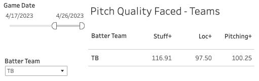 They have now faced the third-highest average Stuff+ in the league this year (behind NYY and DET). You can find all of that on the “Pitch Quality Against” tab of the main MLB dashboard.