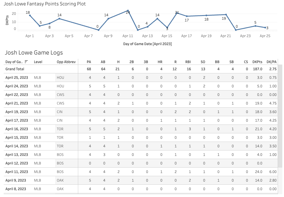 I added a new “Hit Game Logs” tab to the MLB & MiLB Stats Dashboard yesterday, here’s what that looks like with our current example of Lowe: