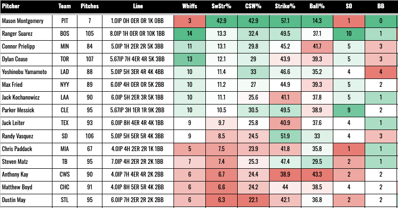 Ten strikeouts for Ranger Suarez. He’s given up four earned runs three times, but he’s thrown three outings of 6, 8, and 8 scoreless innings in his last four outings. The K% came up to 22% after last night. So he’s back to being a confident start, but still without much upside.