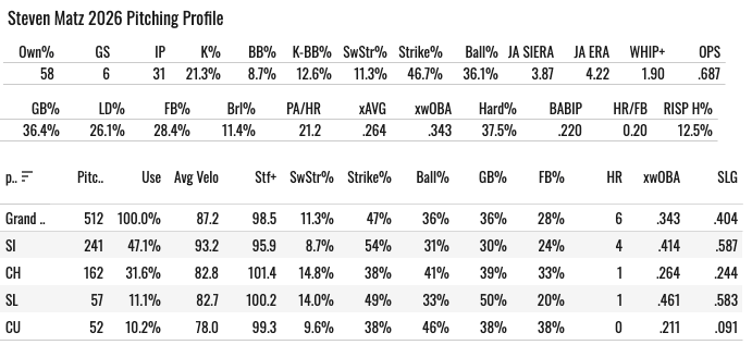 We always thought he might be a guy who can outdo his peripherals with the command the delivery and the left-handedness and all of that. So it’s not shocking to see him outdoing his 12.3% SwStr%. But I still don’t think he’s a high strikeout guy. Maybe 25-26%.