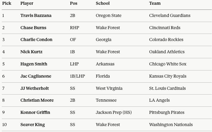 Travis Bazzana got the call for the Guardians. He’s a second baseman, and he was the #1 overall pick of the 2024 draft. Ahead of Nick Kurtz and JJ Wetherholt, don’t you know.