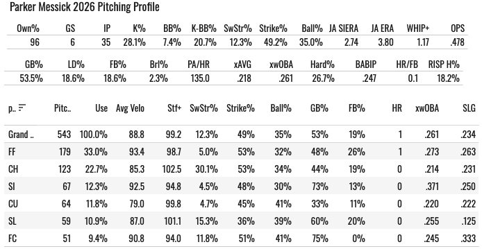But you’re starting Messick every single time, obviously. He’s getting ahead, he’s throwing six different pitch types, the changeup has been insanely good, and between his four-seamer (33% usage) and that change (23%) usage, he’s allowed an xwOBA below .270. Crazy stuff, good for that guy.