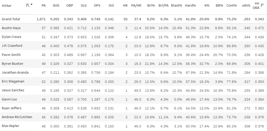J.P. Crawford - 0.435 xwOBA, 12.9% Brl%, 89.8% Contact%, 24.8% Chase%, 19.6% K%