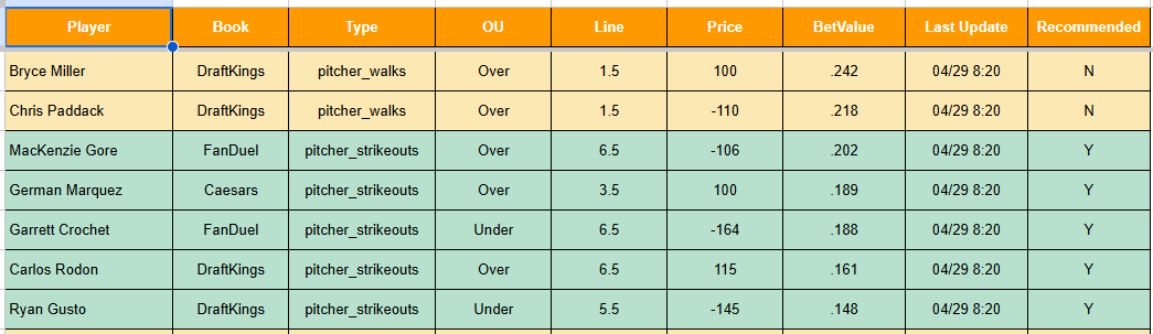 Green means that’s a bet type (using the market type and the over or under) that has been profitable to this point in the season. It will check the bets performance every day fresh. Before, it was just hard coded rules based on my one-time checking of how things were going. So now, it will work smarter. I surely can’t guarantee that bets that have been profitable in the first month will be profitable in the next month, but it’s working a little bit better now.