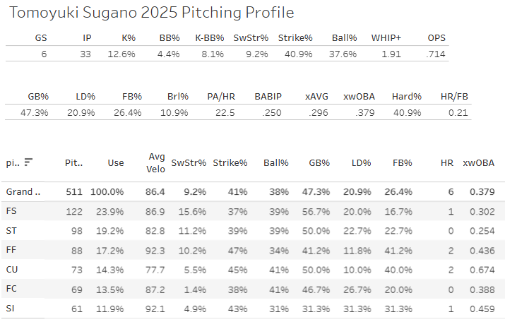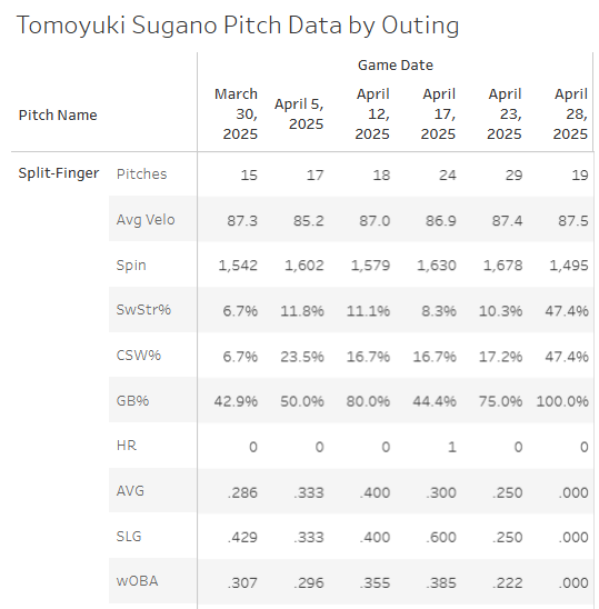 He started his season with five straight outings with splitter SwStr% under 12%. And then he busted off for 47% last night. Weird stuff. Don’t add Sugano… but maybe think twice before hooking your entire DFS slate weight to a Yankees stack against him!