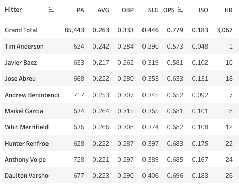 Joey Loperfido got the call up for the Astros. He’ll play some outfield and first base, I guess. The Astros finally don’t have a stacked lineup, and Jose Abreu has been one of the worst hitters in the league for the last two seasons. Here are your hitters with 600+ PA and an OPS below .700 since last season: