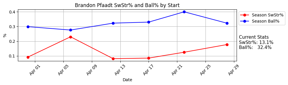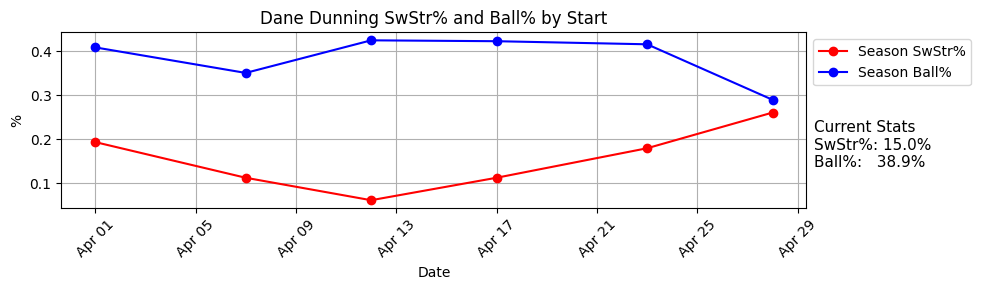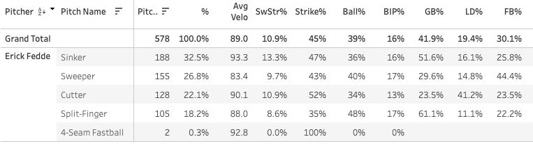 13.1% SwStr%, 49.5% Strike%, 32.4% Ball%, 26% K%, 4% BB%, 40% GB%