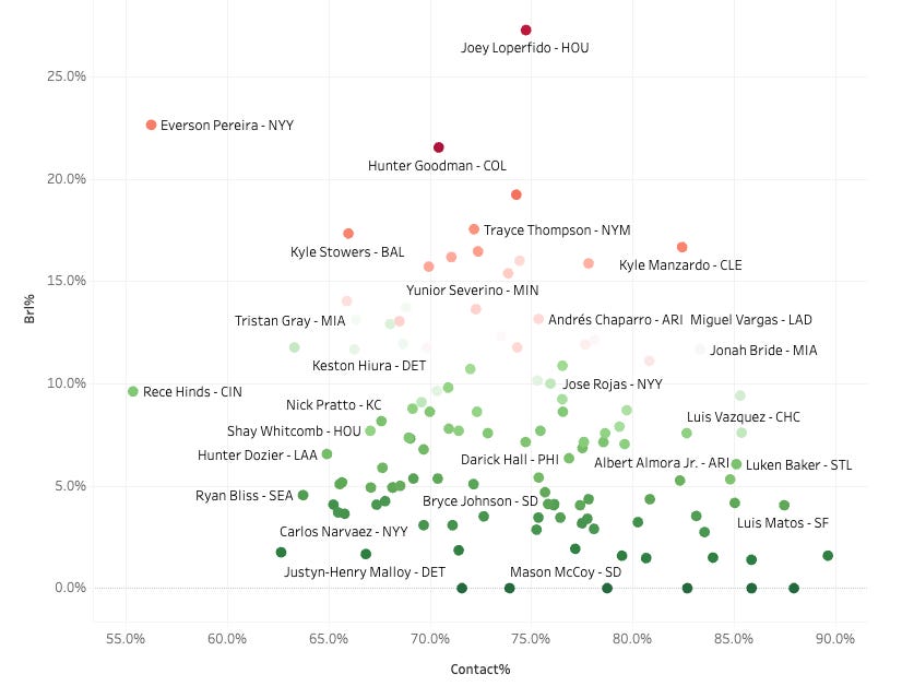 But anyways, Loperfido has put up his numbers by rarely missing on contact. He has 18 barrels, a 44% GB%, a 92.7mph average exit velo, a 106.6 90th-percentile EV, and a fine 11 degree average launch angle.