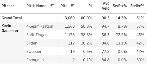 So I don’t know what to say. I think he’ll still be good this year, but I’m a little concerned about the lack of SwStr% - although there’s no reason to be confident that the whiffs won’t come back. I suppose Gausman would still be in my top 10 SPs rest of season.