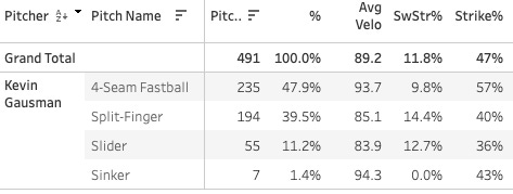 93 pitches, 8.6% SwStr%, 50.5% Strike%, 26.9% Ball%