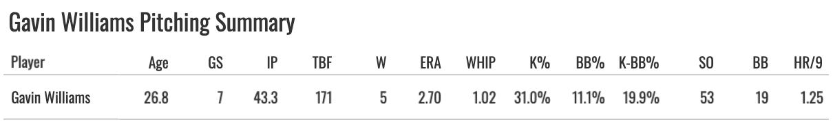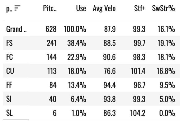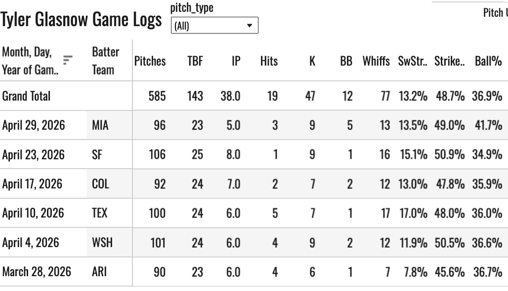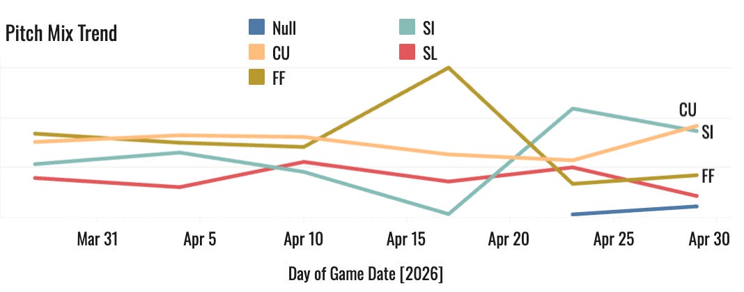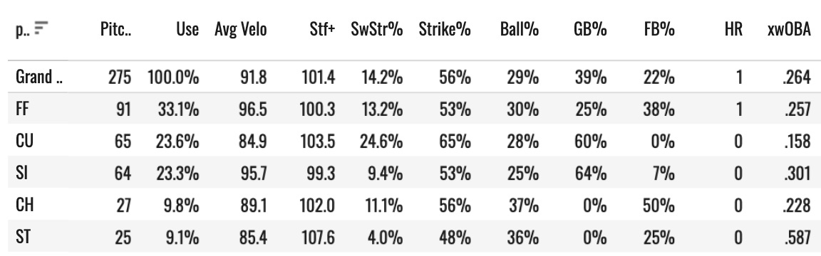It’s what we saw last year that got us interested. Good velo and good strike numbers on the four-seamer, and a really good curveball. The curveball is also working at 23% usage with that 53% Strike% and 64% GB%. Those matchups have been against the Giants, Braves, and Mets.